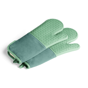 Das Set zieht wahlweise in Grau oder Mint bei dir ein und schützt deine Hände mit einer strukturierten Silikonoberfläche sowie deine Unterarme mit extra langen Schaften beim Griff ans heiße Kochgeschirr.